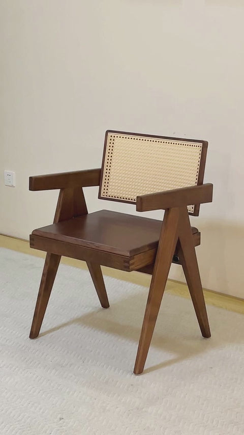 天然木のやわらかな質感と、背もたれに編み込まれたラタンの透け感。